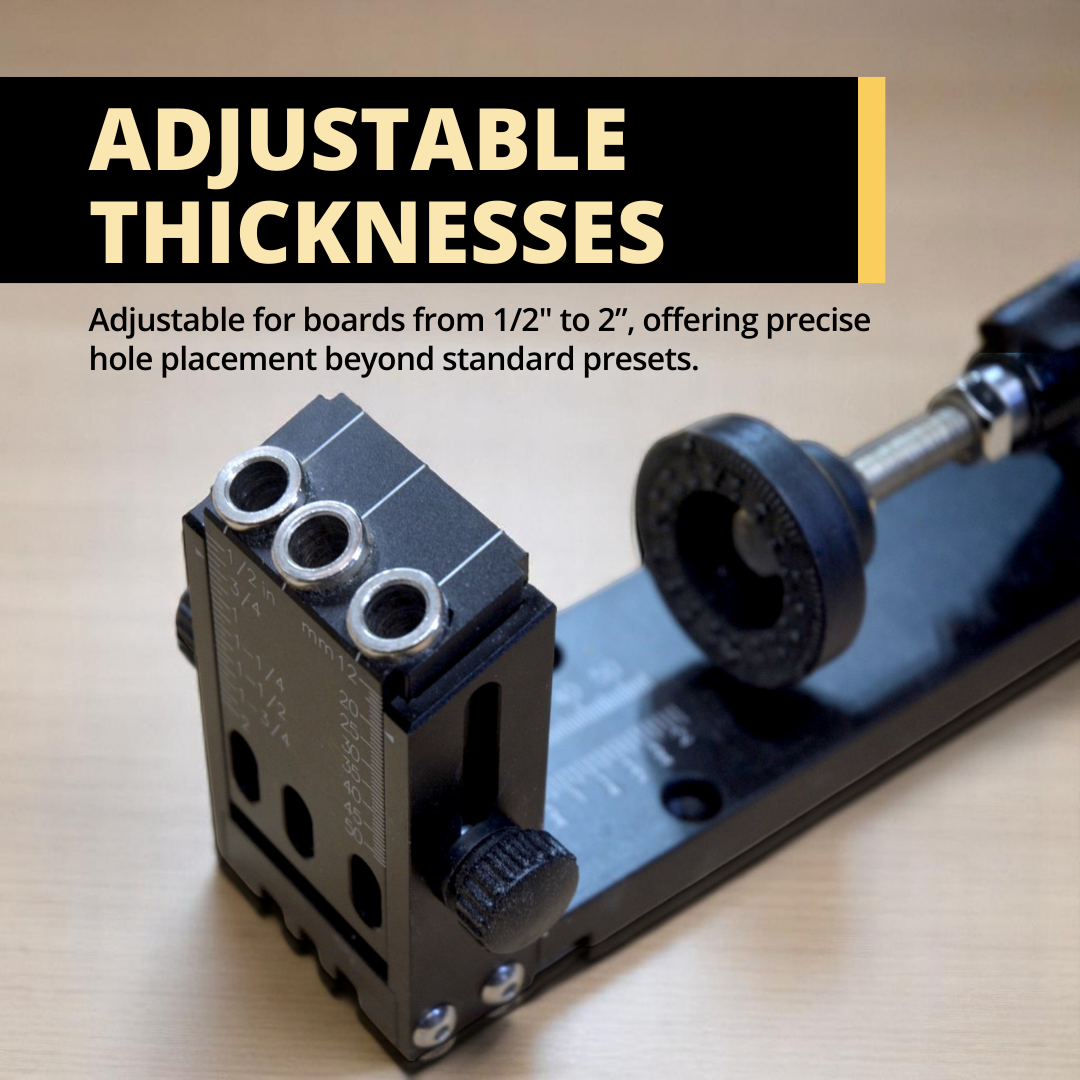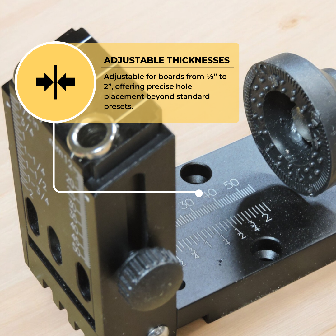 Adjustable for boards from 1/2" to 2", offering precise hole placement beyond standard presets.