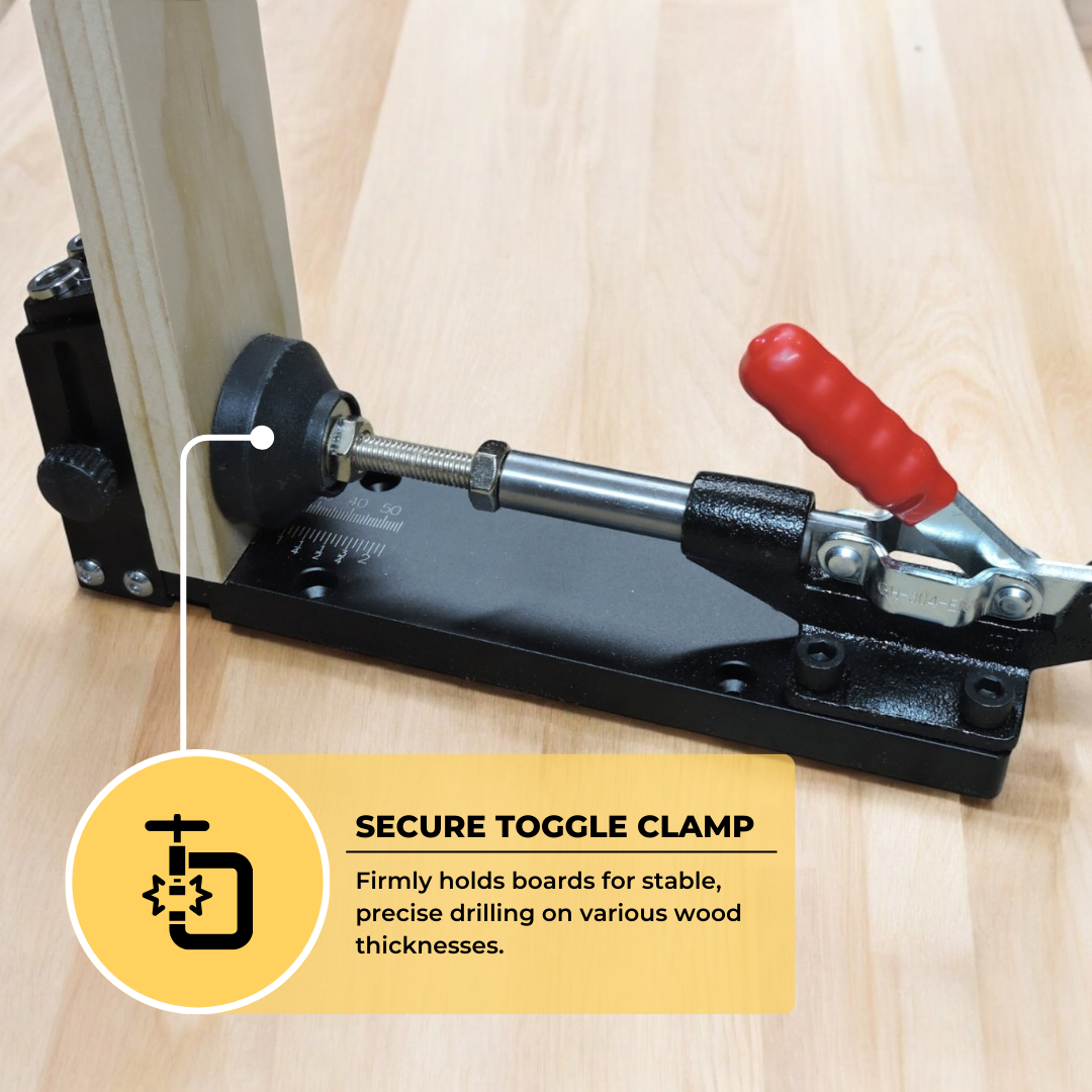 Toggle clamp with adjustable pads holds boards firmly in place for consistent drilling.
