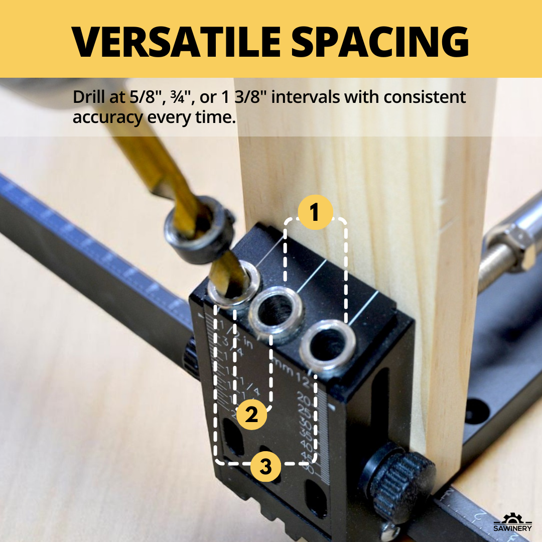 Drill holes at 5/8”, ¾”, or 1 3/8” intervals with precise positioning every time.